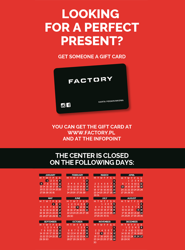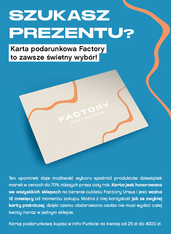 Zapakuj swój prezent w Factory! ?Odwiedź nasze centrum handlowe i skorzystaj ze świątecznej usługi pakowania upominków.Wybierz papier, wstążkę i dodatki, a nasi pomocnicy Mikołaja przygotują pięknie zapakowane niespodzianki dla Twoich Bliskich ?Aby skorzystać ze stacji należy pobrać aplikację FACTORY i zarejestrować się w programie Style Club - wtedy zapakujemy upominki za darmo! Stacja działa w dniach 4-7, 11-14, 18-23 grudnia przy salonie JOOP! ?Spraw, aby każdy prezent wyglądał wyjątkowo!Regulamin znajdziesz [TUTAJ]
